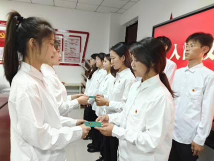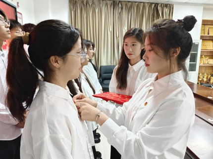 优秀团员代表宋晨宏,古斌娴等为新团员颁发团员证,佩戴团徽。一枚枚鲜艳的团徽在新团员的胸前熠熠生辉,提醒他们时刻牢记团员身份,发挥共青团员的先锋模范作用。