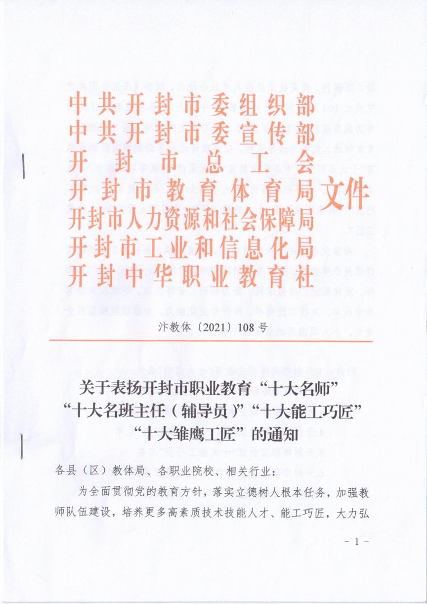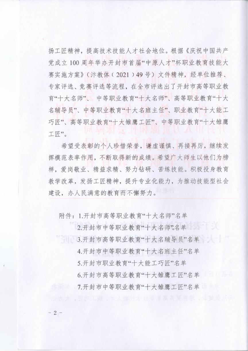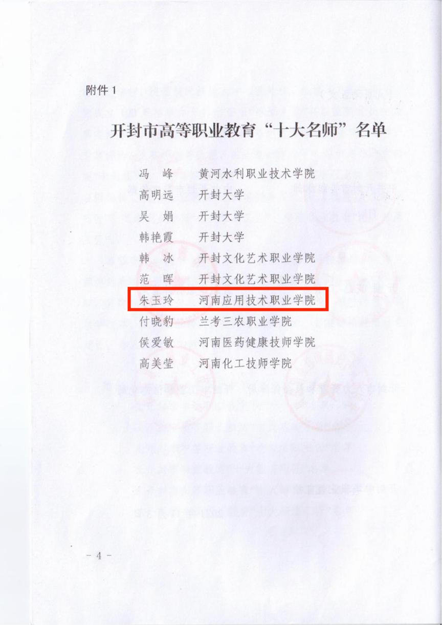 2021年12月16日,由中共开封市委组织部主办、开封市教育体育局承办的首届“中原人才”杯职业教育技能大赛颁奖仪式在汴梁小宋城举行,米兰官网制药工程学院朱玉玲老师经过层层选拔和严格考核,被评为开封市高等职业教育“十大名师”荣誉称号。