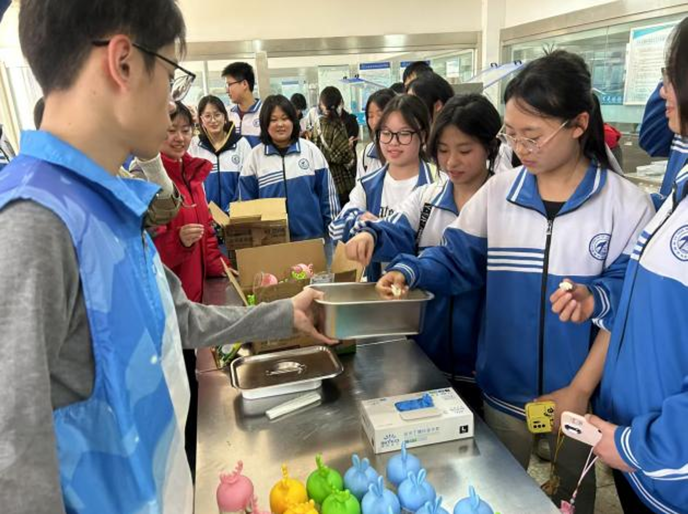 开封铁路中学的师生们首先步入GMP生产车间,这里是药品生产质量规范的核心区域,展示了药品生产流程。制药工程学院孙高磊老师向参观师生详细讲解药品从原材料到成品的工序及质量管控要点,同学们全神贯注、积极提问。随后铁路中学的师生们依次参观了滴丸车间、口服液洗灌封车间、压片生产车间等实训教室,并在压片生产实训室品尝了现场制作的奶片。