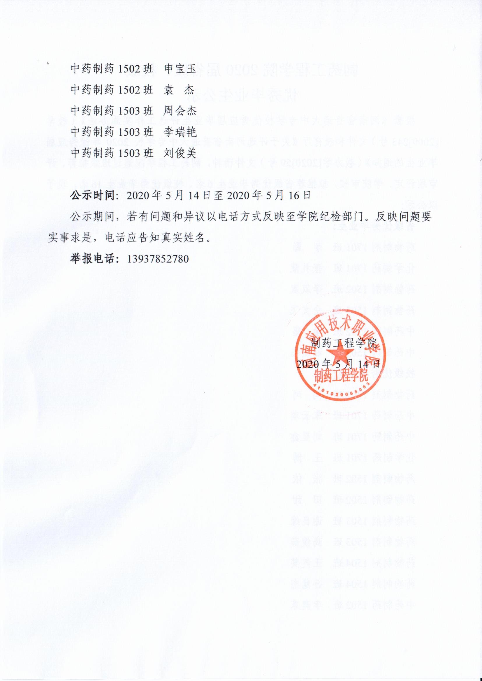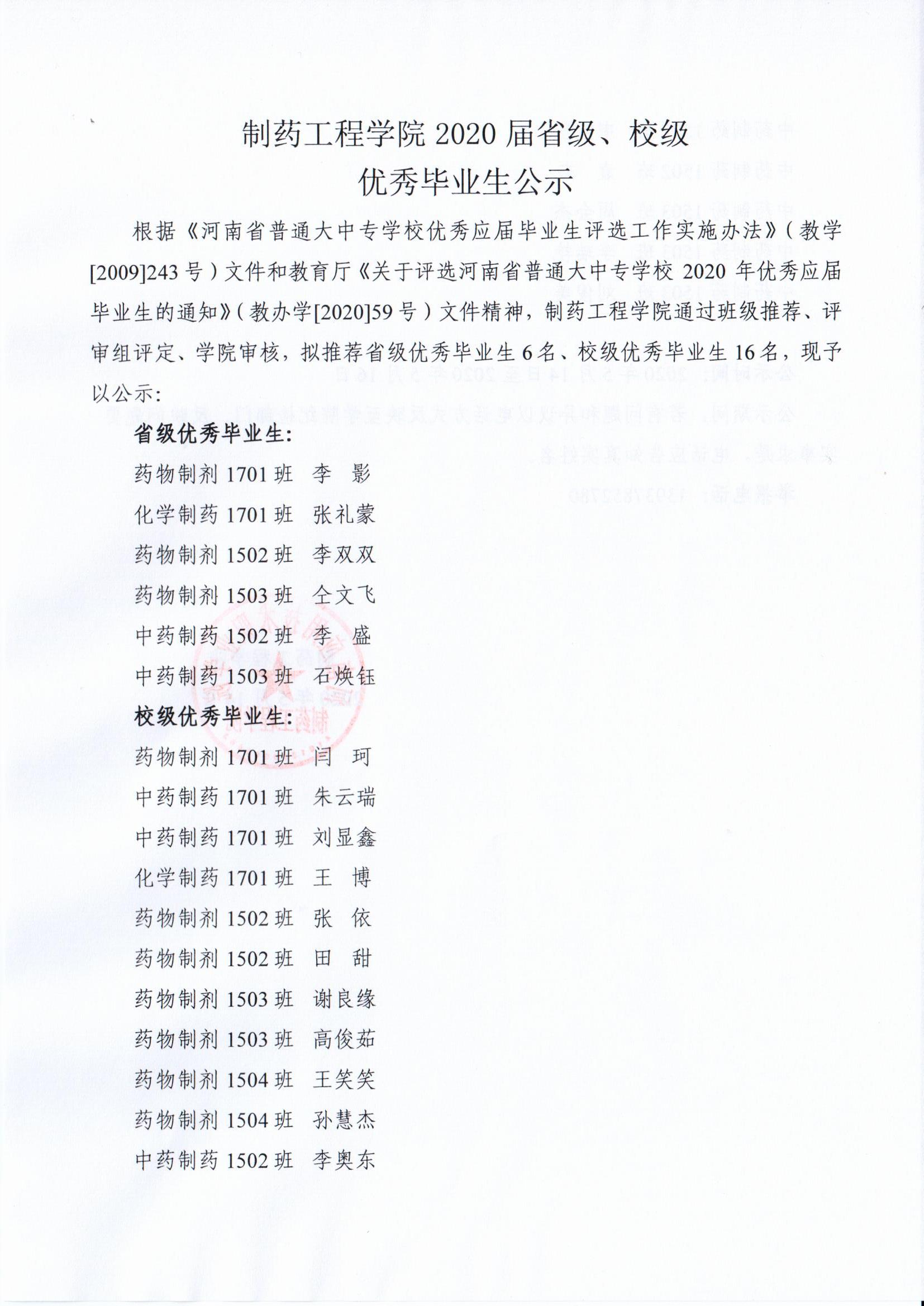 制药工程学院关于评选2020届省级、校级优秀毕业生公示