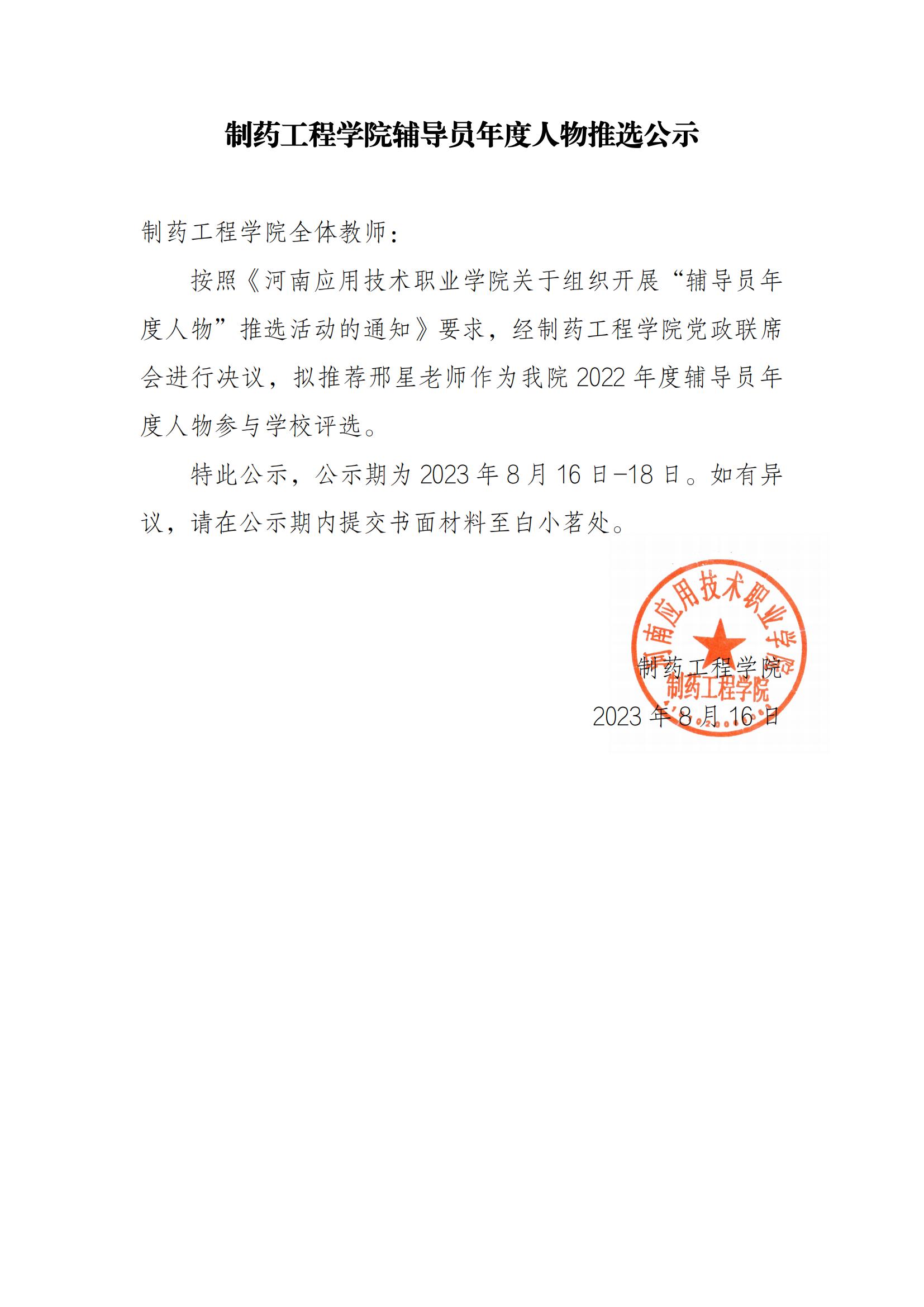 制药工程学院辅导员年度人物推选公示