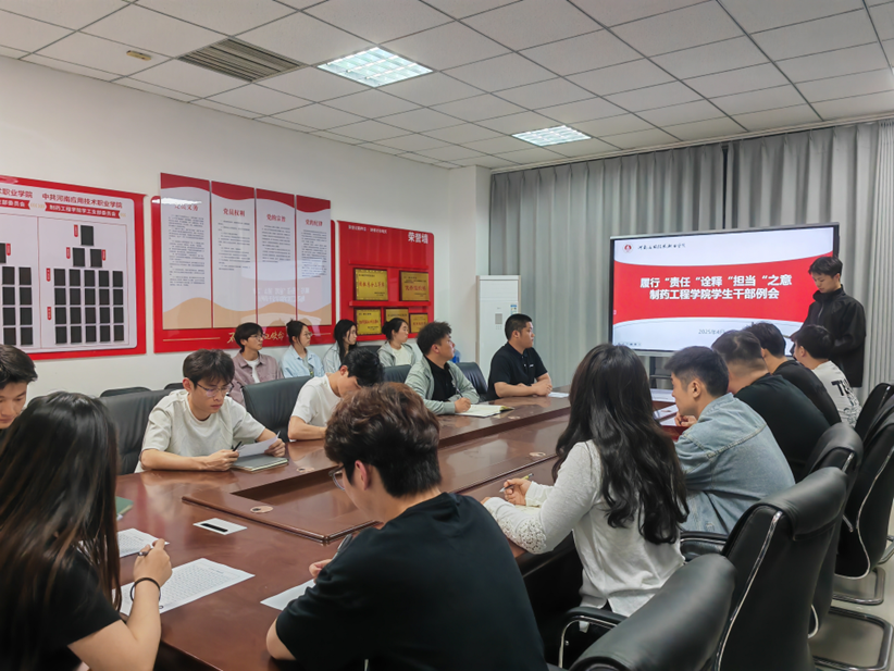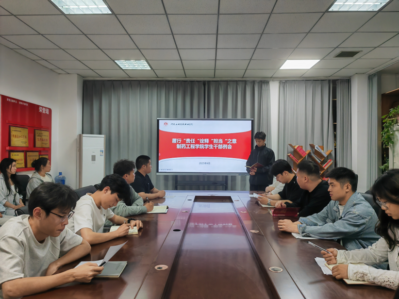 为扎实做好学生会干部各阶段工作任务,加强学生干部协作能力和服务水平,充分发挥学生干部模范带头作用,制药工程学院于2025年4月7日在行政楼301召开学生干部例会,制药工程学院学生会主席团及各部部长、副部长参加会议,会议由主席团祝海辰主持。