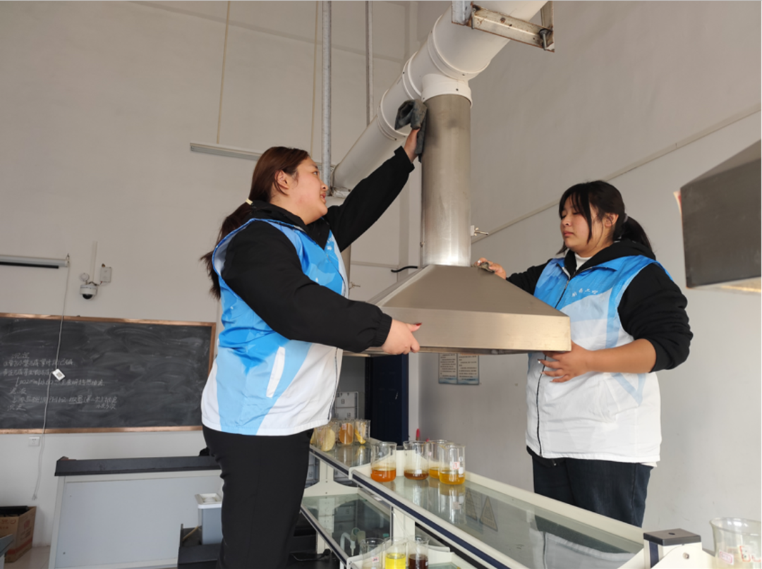 活动现场,在指导教师的统筹部署下,志愿者们遵循“高标准、精细化”的劳动准则分组行动。大家手持抹布细致擦拭实验操作台与精密仪器,俯身清理设备死角的积尘,规范规整药品耗材柜,以饱满的热情和严谨的态度,生动诠释了“爱岗敬业、争创一流”的劳模精神内涵。经过三小时的协同奋战,实训室玻璃洁净透亮,仪器设备摆放井然有序,地面光洁无污,丰硕的劳动成果赢得了实验指导教师的充分肯定与高度赞誉。