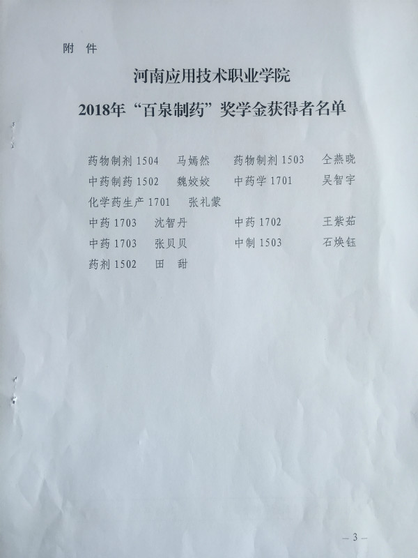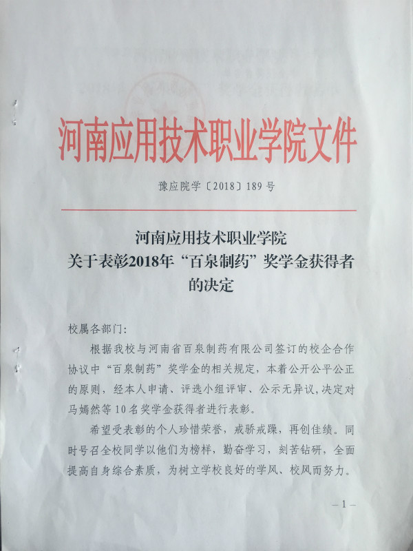 根据米兰官网与河南省百泉制药有限公司签订的校企合作协议中“百泉制药”奖学金的相关规定,本着公开公平公正的原则,经层层评审,米兰官网共6名同学荣获该项奖学金。