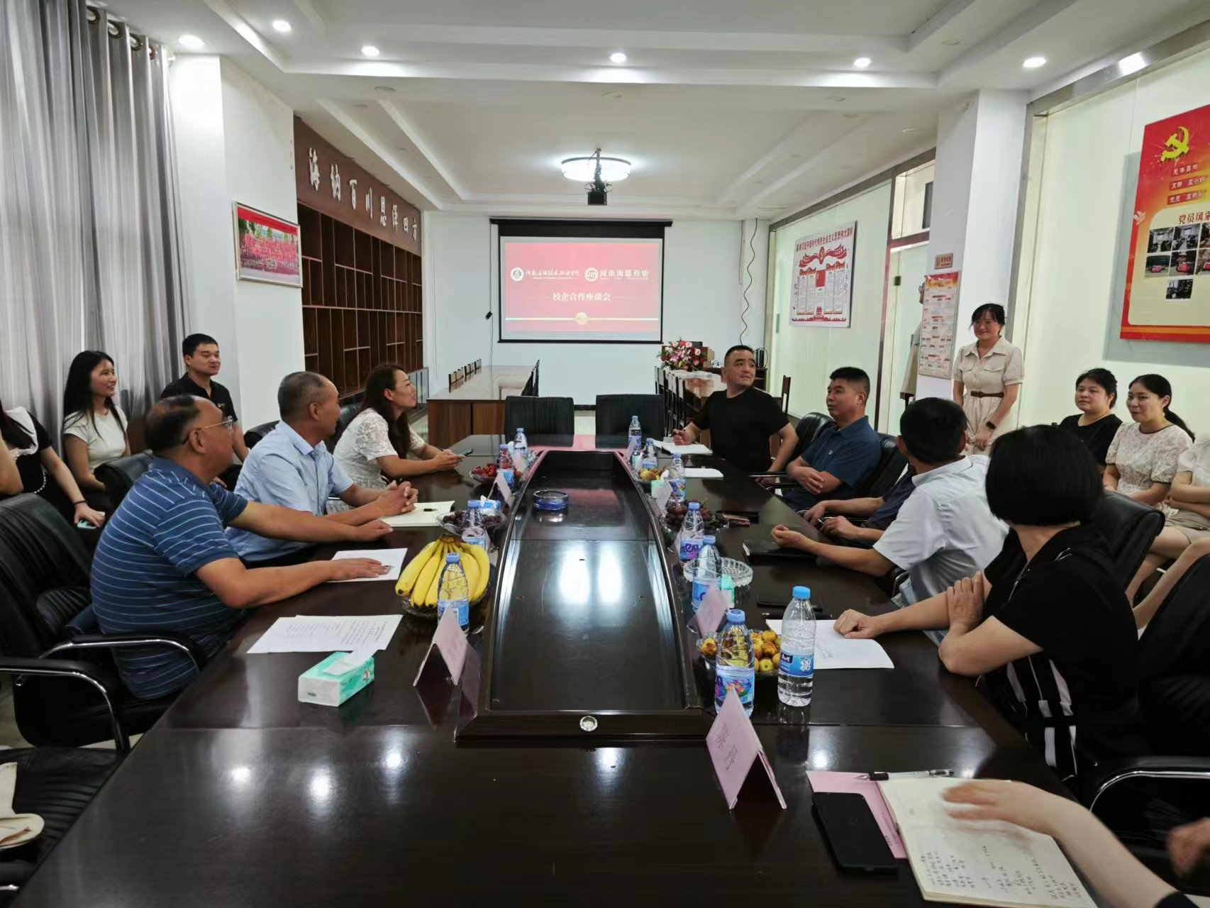 在河南海恩药业交流座谈会上,企业方代表周东,宋继凯,孔德凤,韩性志,陈丹等对窦传斌一行的到访表示热烈欢迎。在会上企业领导宋继凯从企业概况、企业发展规划和人才需求等方面对企业进行了详细介绍,并观看了企业发展的宣传短片。学院总支书记窦传斌从学校的发展概况、制药工程学院专业特点、在校生人数与毕业生情况以及发展前景等进行详细讲解。随后,双方围绕校企合作有关项目合作、学生实习实训和毕业生就业招聘问题等方面进行交流座谈,并与米兰官网部分在岗往届毕业生进行校友座谈。