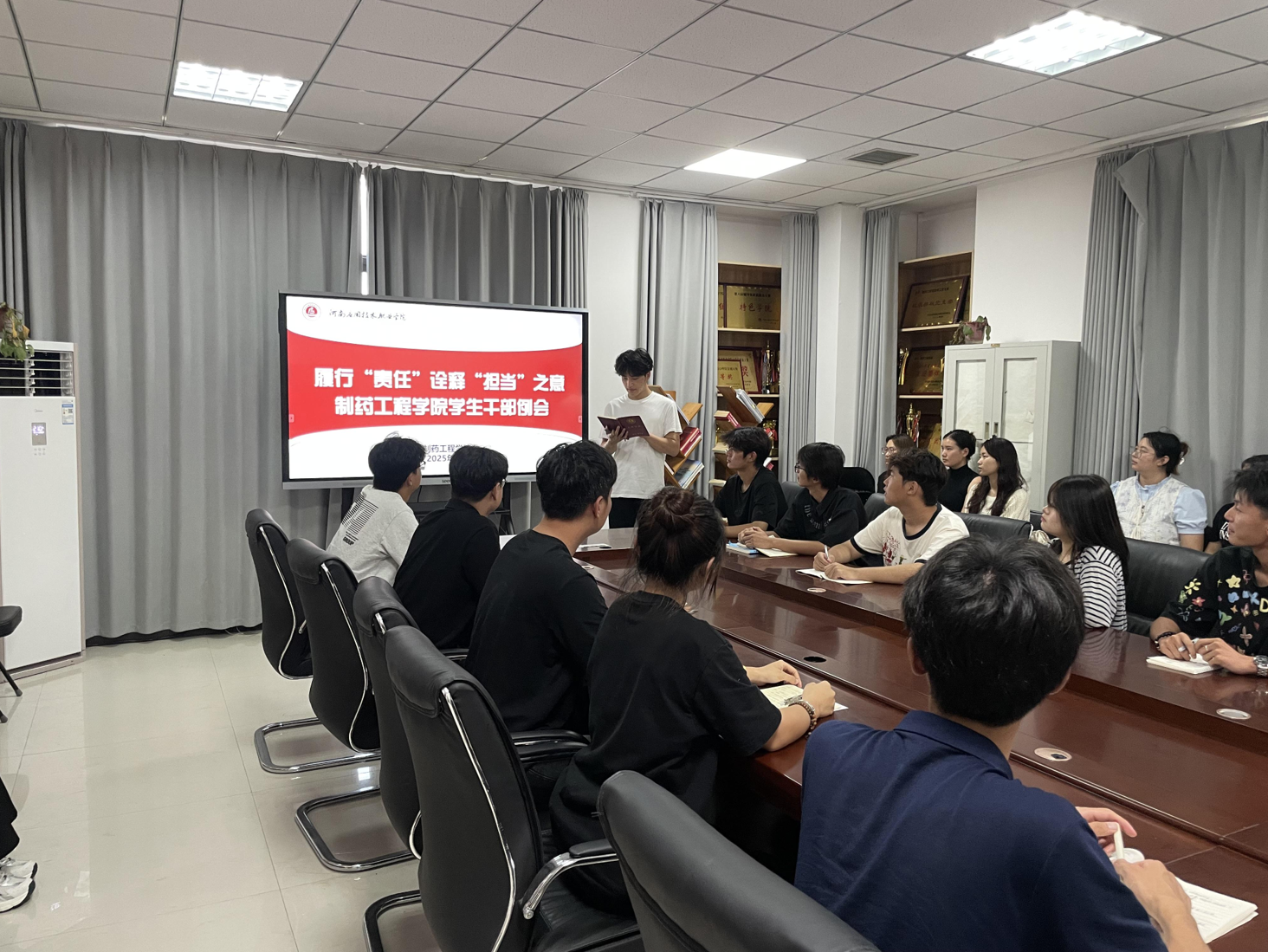 为了进一步增强学生干部的自我管理和自我服务意识,提高干部们的能力水平,制药工程学院于2025年9月1日在办公楼301召开了大二学生干部第一次例会,此次例会各部负责人及主席团参与,会议由学生会主席团成员余生涛主持。